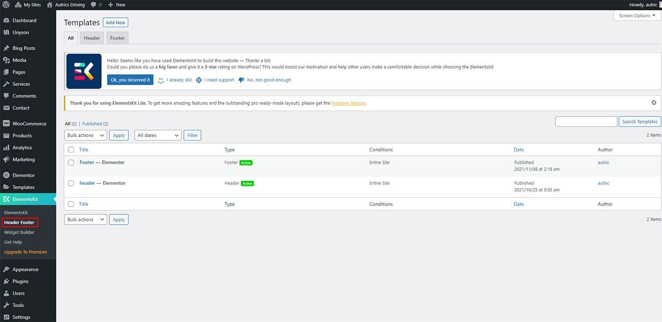 For editing the header and footer, go to ElementsKit > Header Footer.