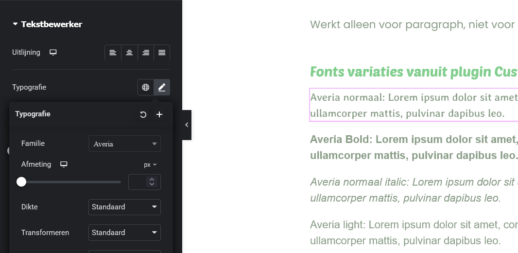 Fonts variaties vanuit plugin Custom Fonts: